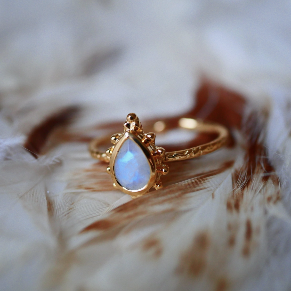 Anillo ajustable en latón chapado en oro de 18 quilates (2 micras), engastado con piedra lunar arcoíris natural. Se ajusta cómodamente de la talla 54 a la 60, ofreciendo versatilidad y estilo.