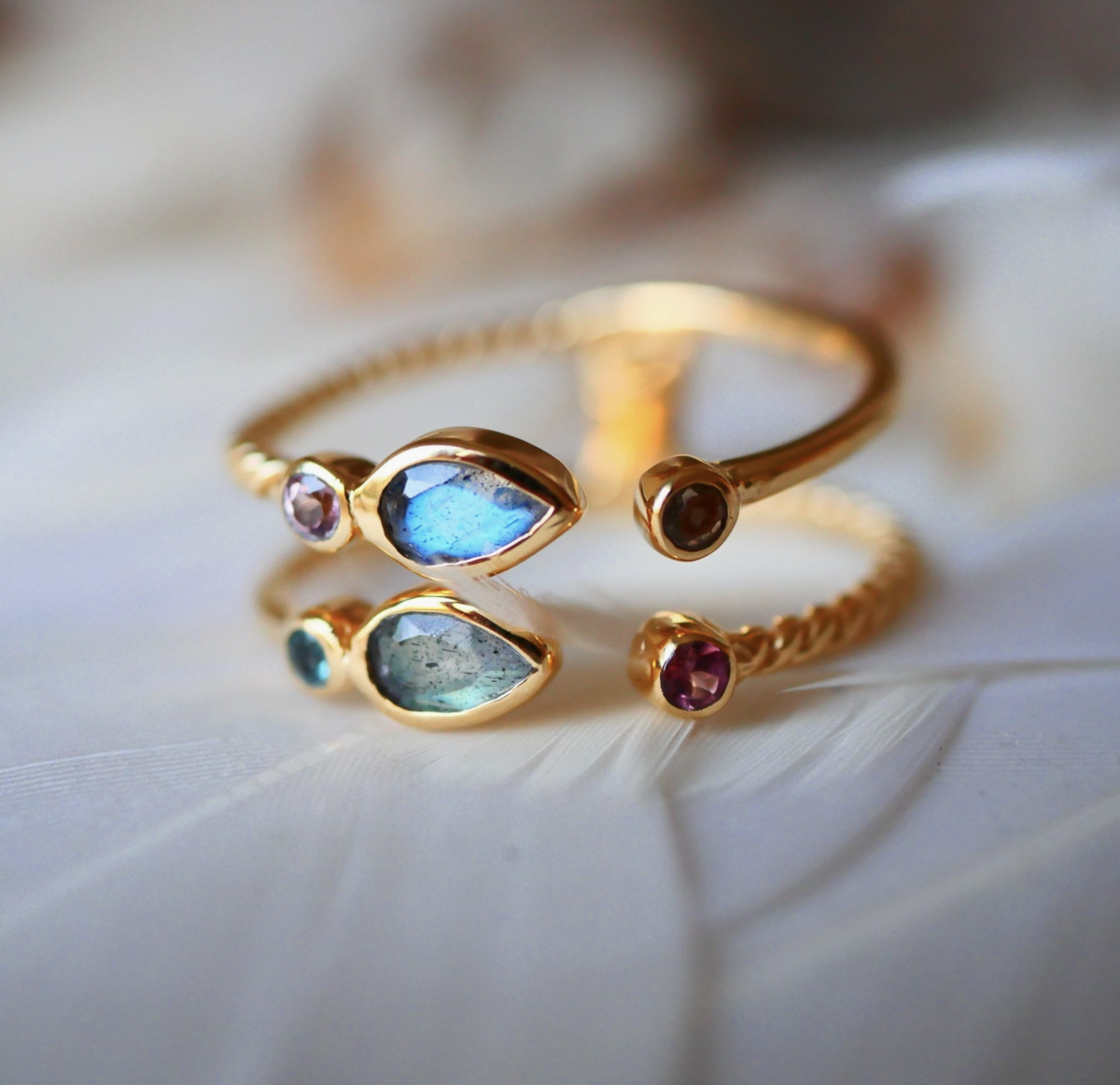 Anillo ajustable en latón chapado en oro de 2 micras, adornado con labradorita y turmalinas multicolores, combinando elegancia y energía en una sola pieza. Se ajusta cómodamente de la talla 58 a la 62.