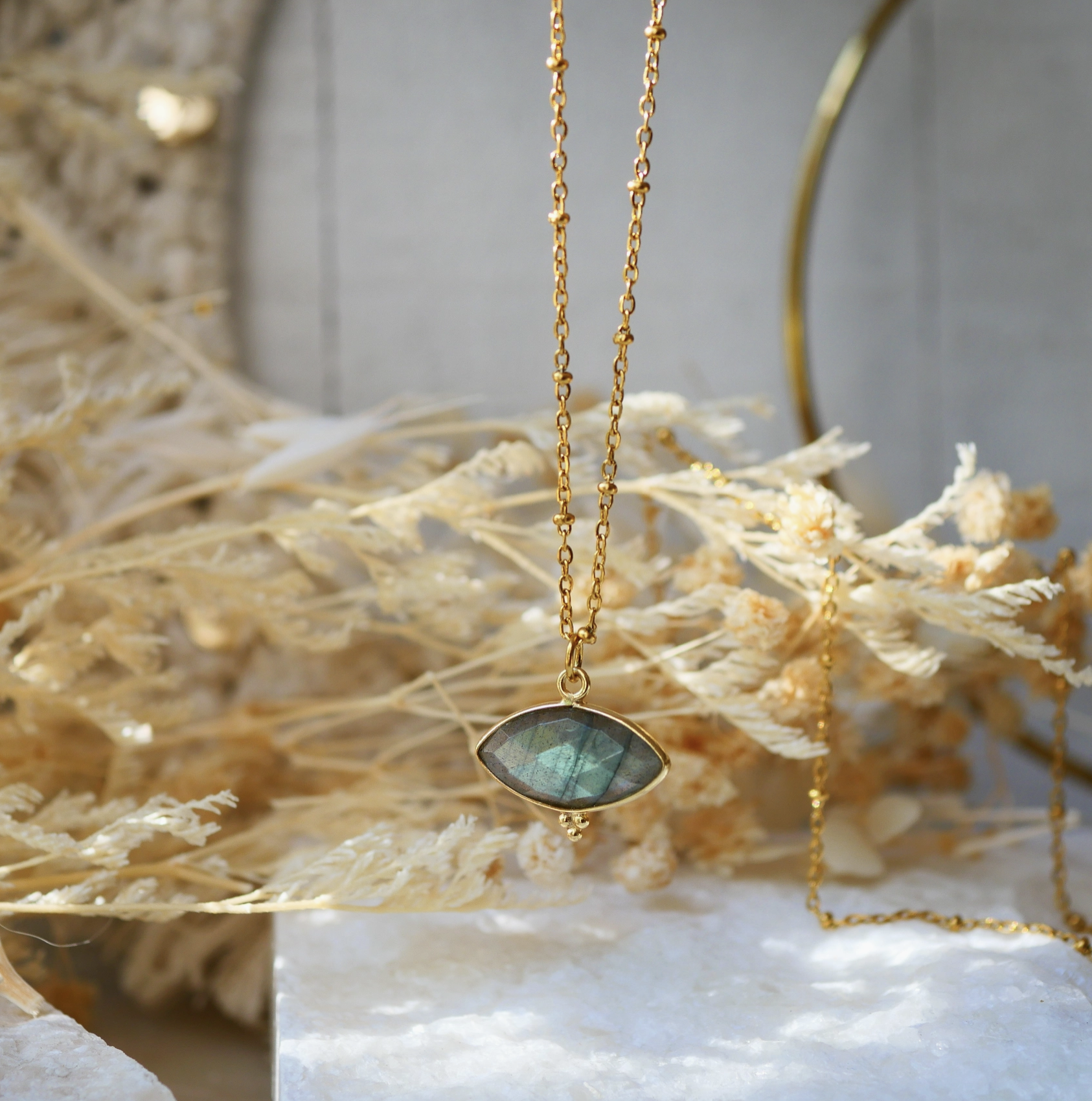 Collar de acero inoxidable con piedra natural de labradorita, ideal para el uso diario por su resistencia y brillo duradero.