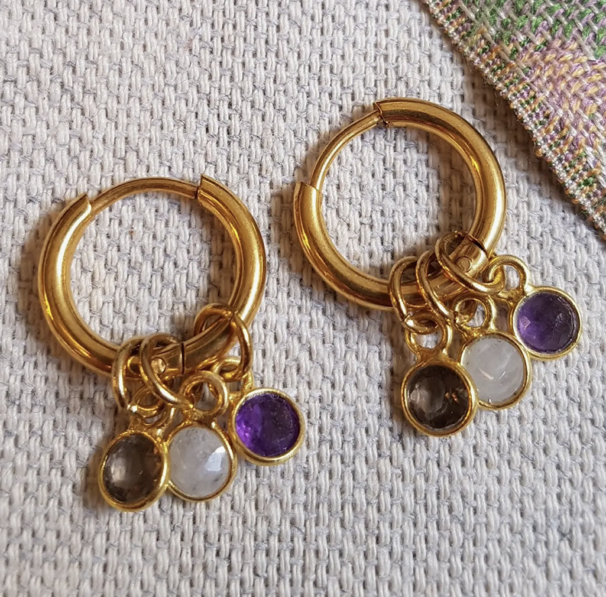 Estos aros de 15 mm son esa pieza esencial y equilibrada que no querrás quitarte. Diseñados para aportar un toque de luz sutil y elegante, combinan tres gemas naturales que crean una sinergia perfecta de calma y protección.