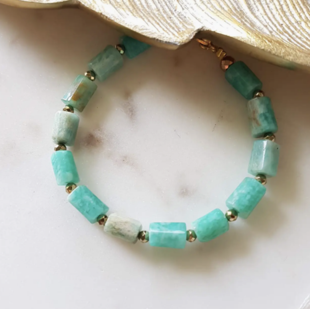 Con Amazonita (Calma y Valentía): Sus refrescantes tonos verde agua son un bálsamo para el espíritu. Esta gema ayuda a calmar el sistema nervioso, disipa las preocupaciones y te da la confianza necesaria para expresar tu verdad con serenidad.